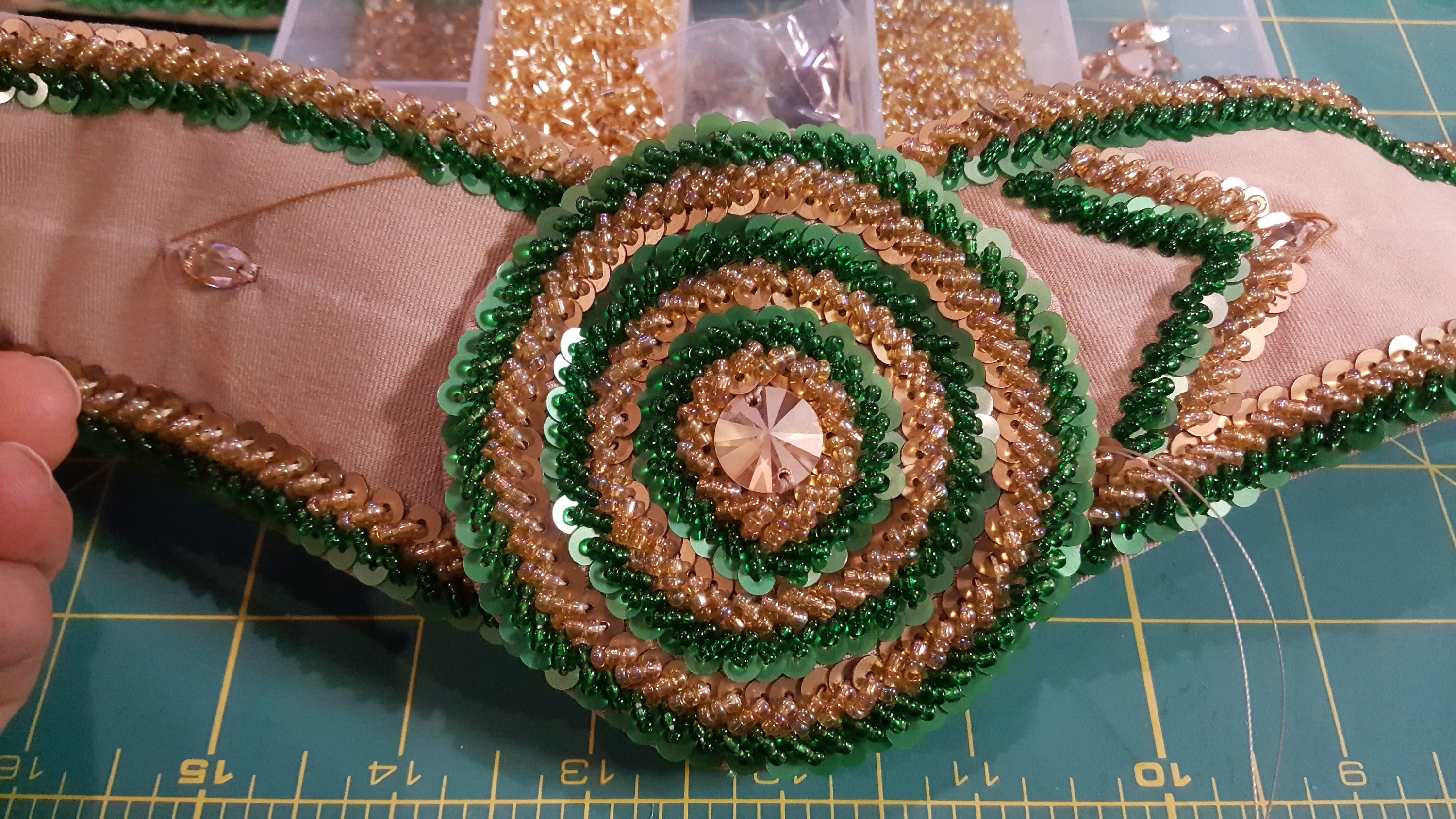 Once that negative space is filled in it starts looking pretty sharp- I opted to fill in the space alternating rows again with color rather than filling it in with all green. Looking forward to completing this section of belt and moving on to the bra!